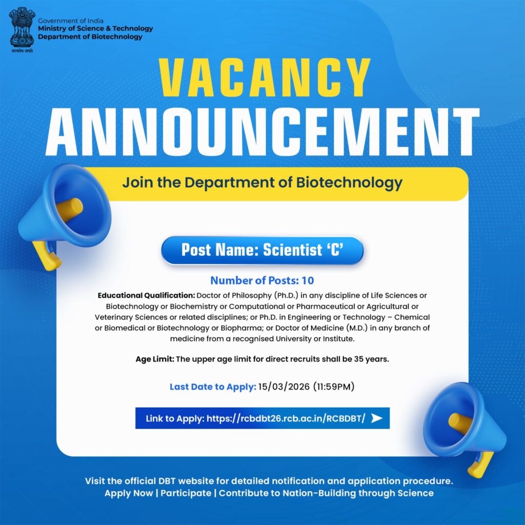 The Department of Biotechnology, under the Government of India, has announced a vacancy for the post of Scientist ‘C’ on its official platform.